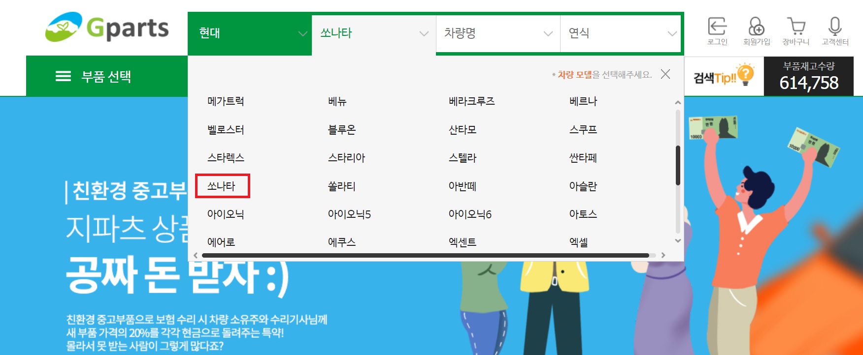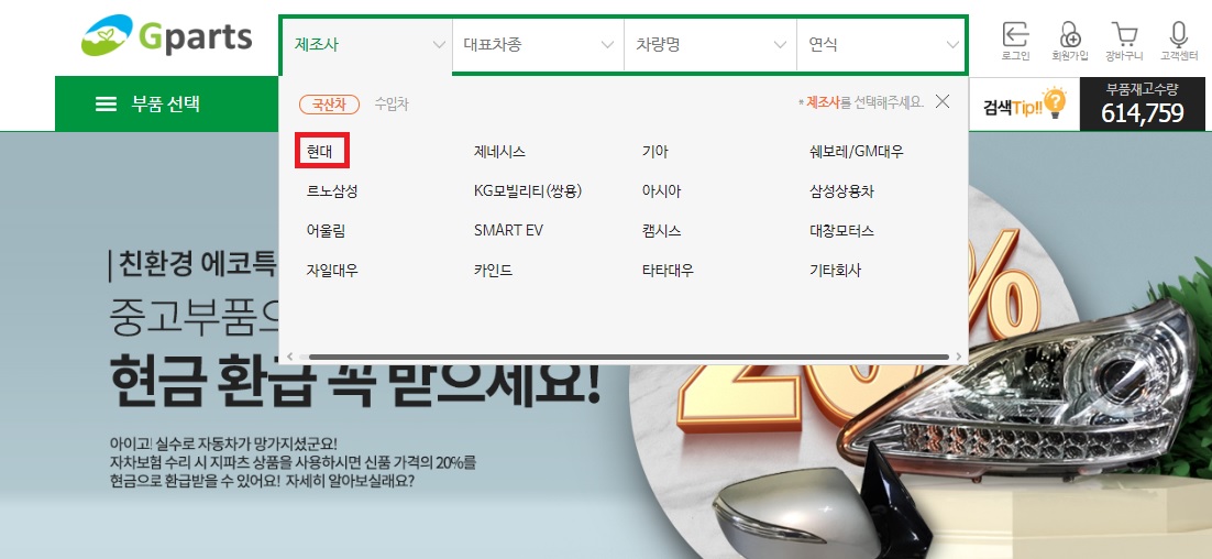 - 아래와 같이 Gparts 사이트에서 제조사 중 '현대'를 선택합니다.