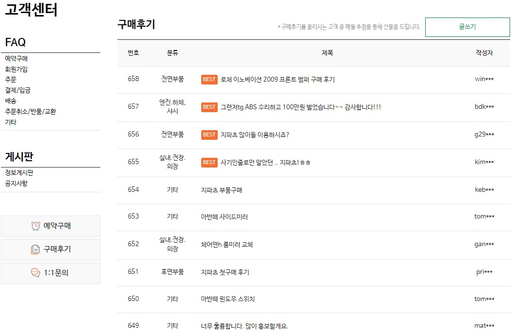 또한 현재 재고가 없는 부품은 예약을 통해 추후 구입이 가능한 장점도 있습니다. 아래 구매후기처럼, 실제 Gparts 쇼핑몰을 접속해 보면 중고 부품을 구입한 많은 분들이 만족하는 점을 알 수 있습니다.