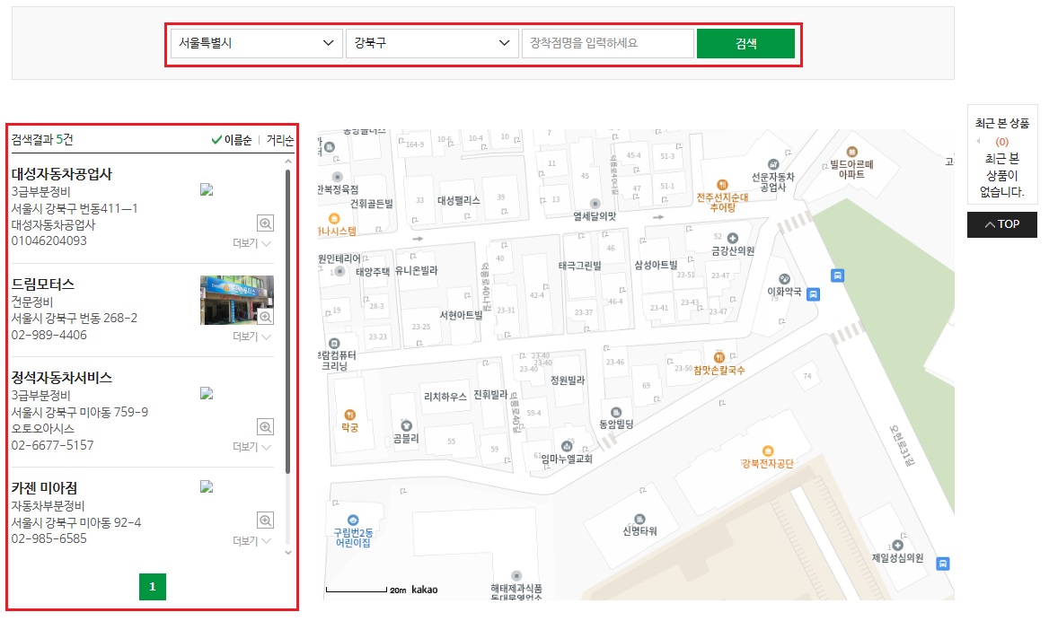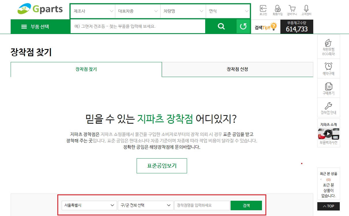 Gparts 쇼핑몰에서 (아래의 사진 상 우측의) '장참점 안내' 경로로 들어가서 '지역'을 선택한 후 검색하면 여러 장착점이 나옵니다.